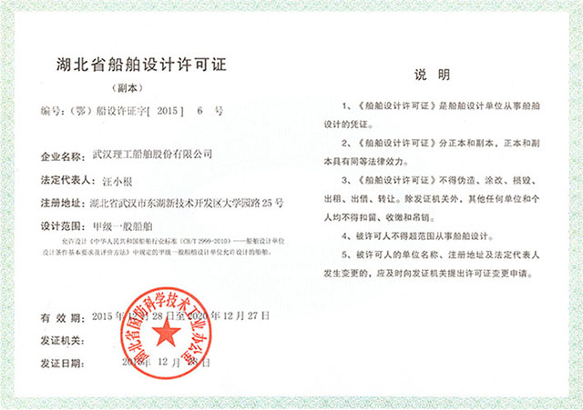 近日,武汉理工船舶股份有限公司顺利通过甲级一般船舶设计单位资质认定评审,由湖北省国防科工办颁发资格证书。依据《中华人民共和国船舶行业标准(CB/T2999-2010)-船舶设计单位设计条件基本要求及评价方法》,评价专家组对武汉理工船舶股份有限公司在通用要求、人员要求、管理要求、技术装备和应用要求四个方面进行认真的审查和评价工作,对武汉理工船舶股份有限公司的资质能力给予科学评价和肯定,一致认为:武汉